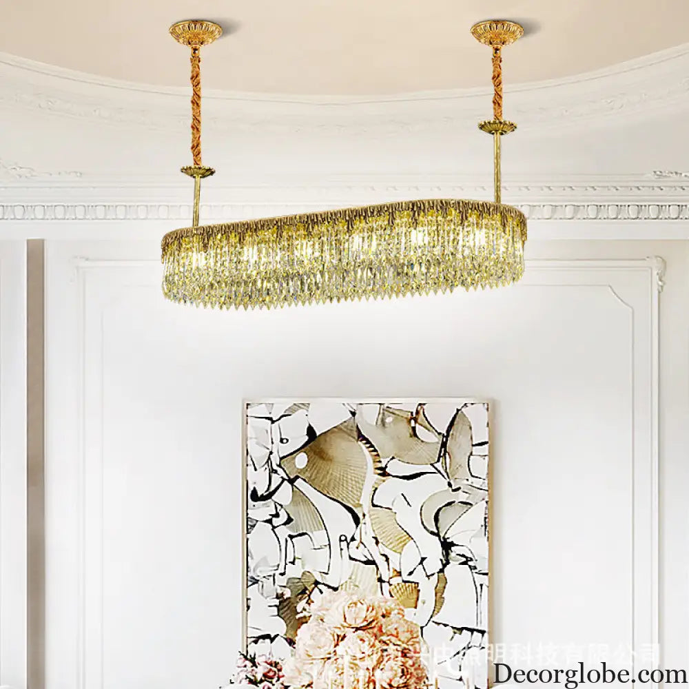 Designed to reflect understated elegance, this French-style all-copper crystal chandelier brings light luxury and refined European charm into contemporary interiors. Its elongated linear silhouette makes it ideal for dining tables, villa living rooms, and high-end bedroom spaces that require balanced illumination with a sophisticated presence.