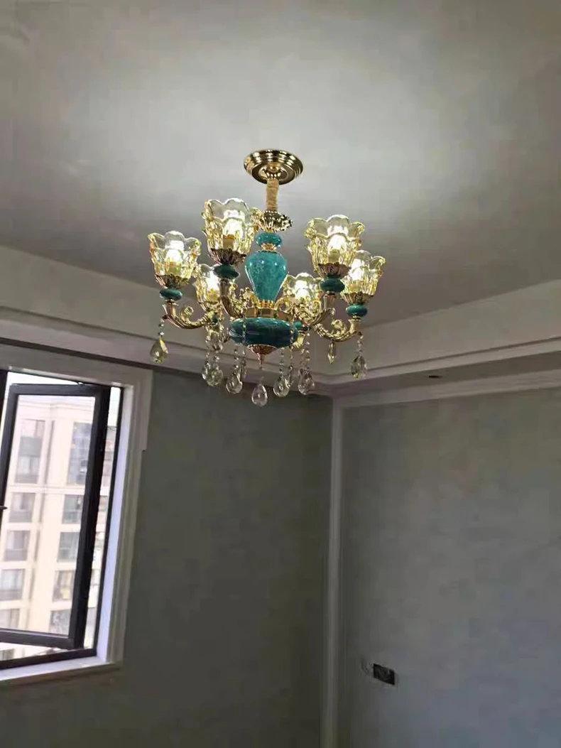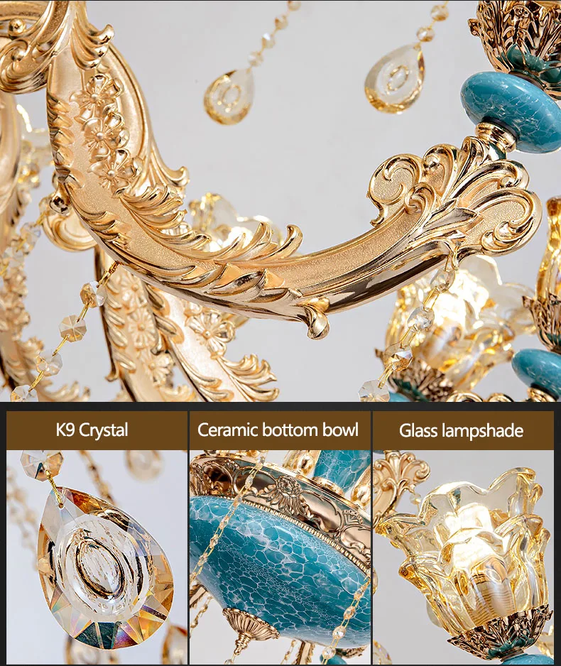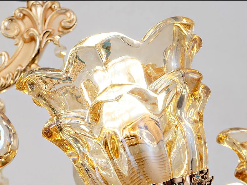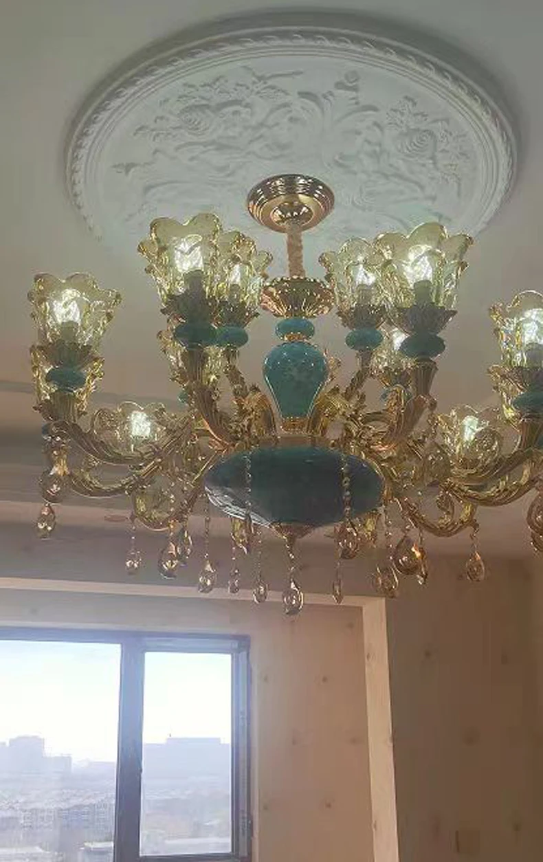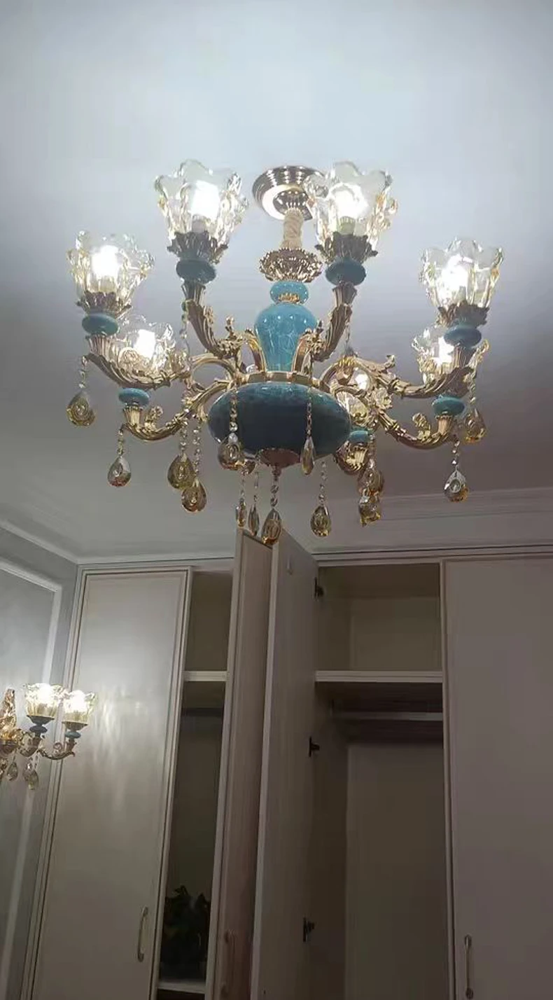 The champagne-colored chandelier looks very elegant, like real crystal. The seller packs all the chandelier parts very well. I have ordered chandeliers from this seller 5 times and everything has always arrived intact. I am very satisfied with the purchase, especially the price!