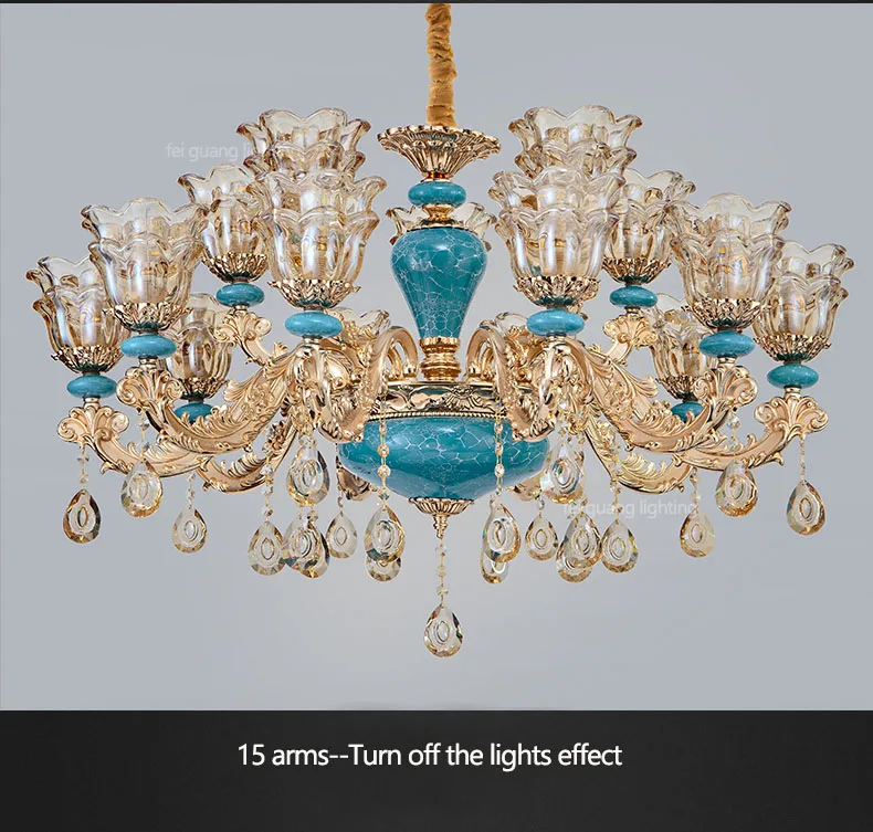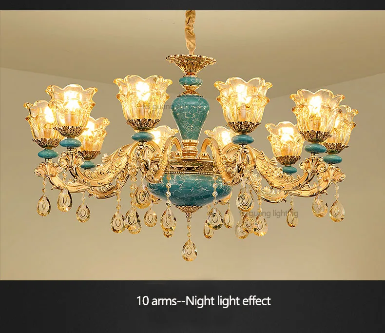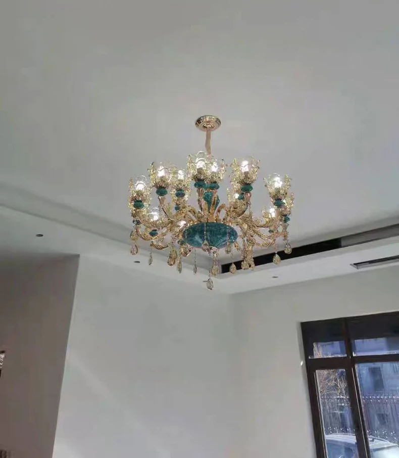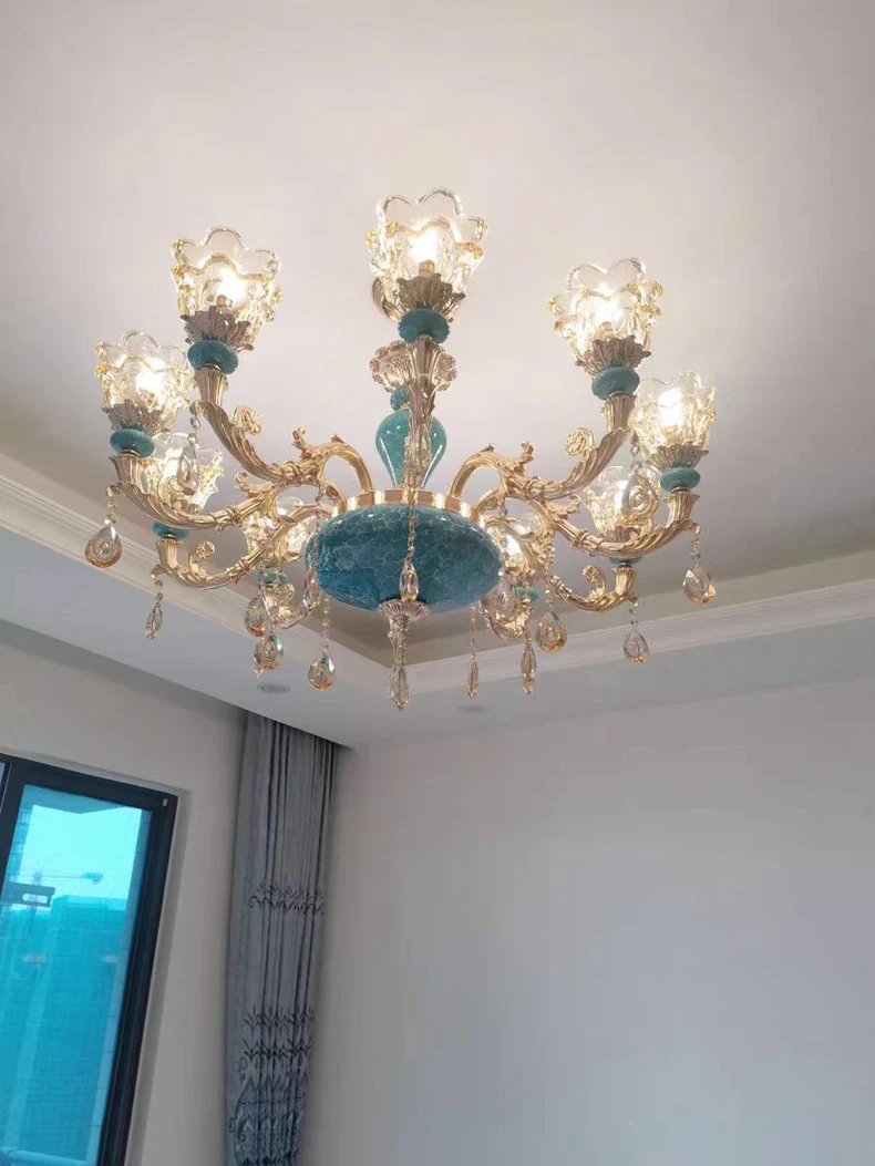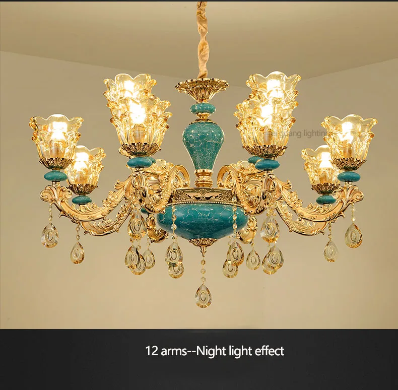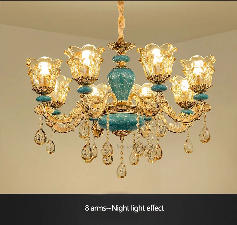 The champagne-colored chandelier looks very elegant, like real crystal. The seller packs all the chandelier parts very well. I have ordered chandeliers from this seller 5 times and everything has always arrived intact. I am very satisfied with the purchase, especially the price!