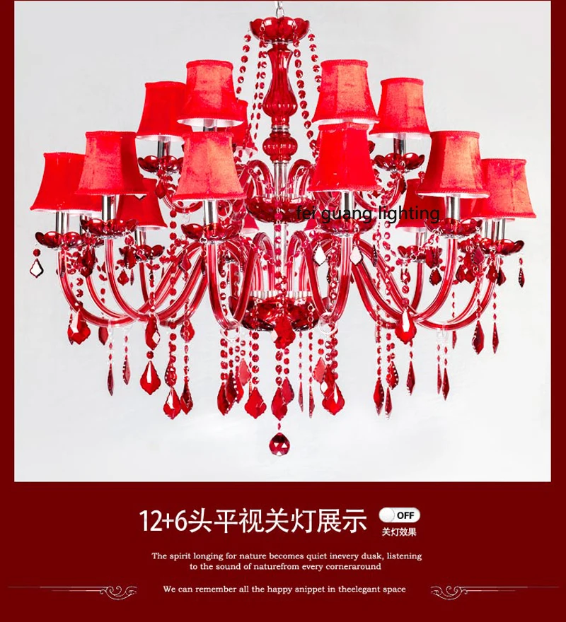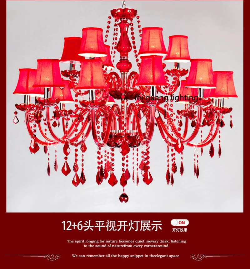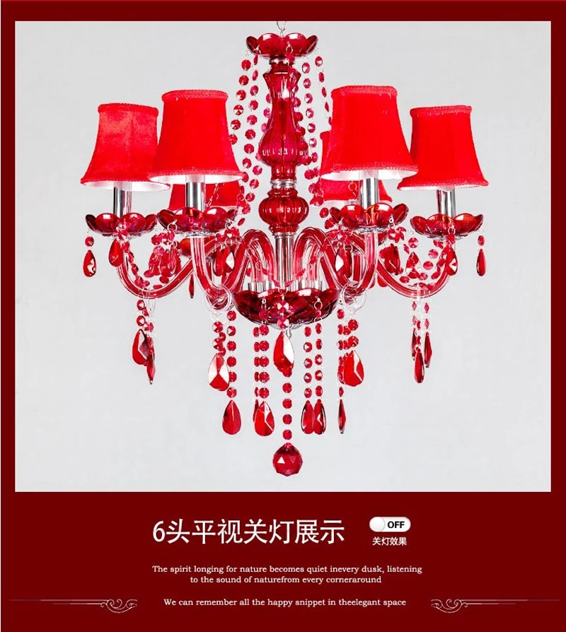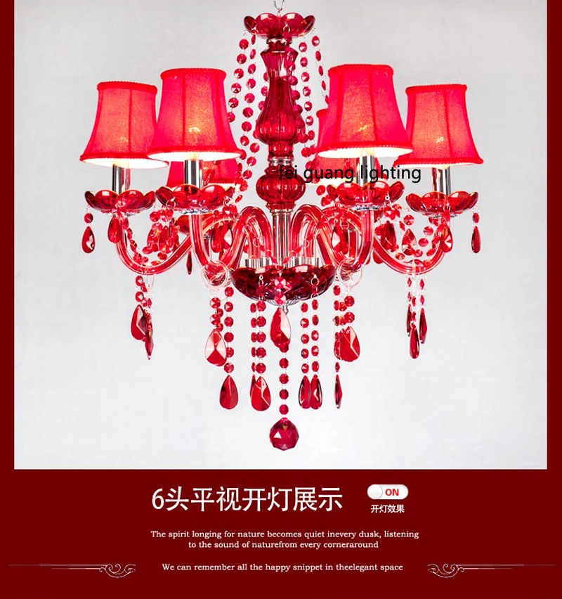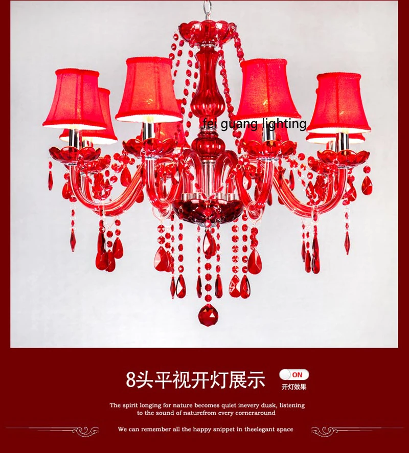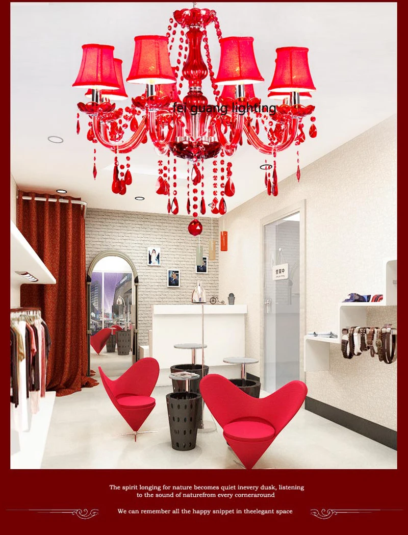 Dieser rote Kronleuchter im Kerzenstil verleiht Innenräumen mit seinem eleganten Design und dem Glaskörper eine kühne und dekorative Note. Die polierte Chromoberfläche und der Stoffschirm erzeugen eine warme, stimmungsvolle Beleuchtung, die sich ideal für Hochzeiten, festliche Dekorationen und stilvolle Wohnräume eignet.