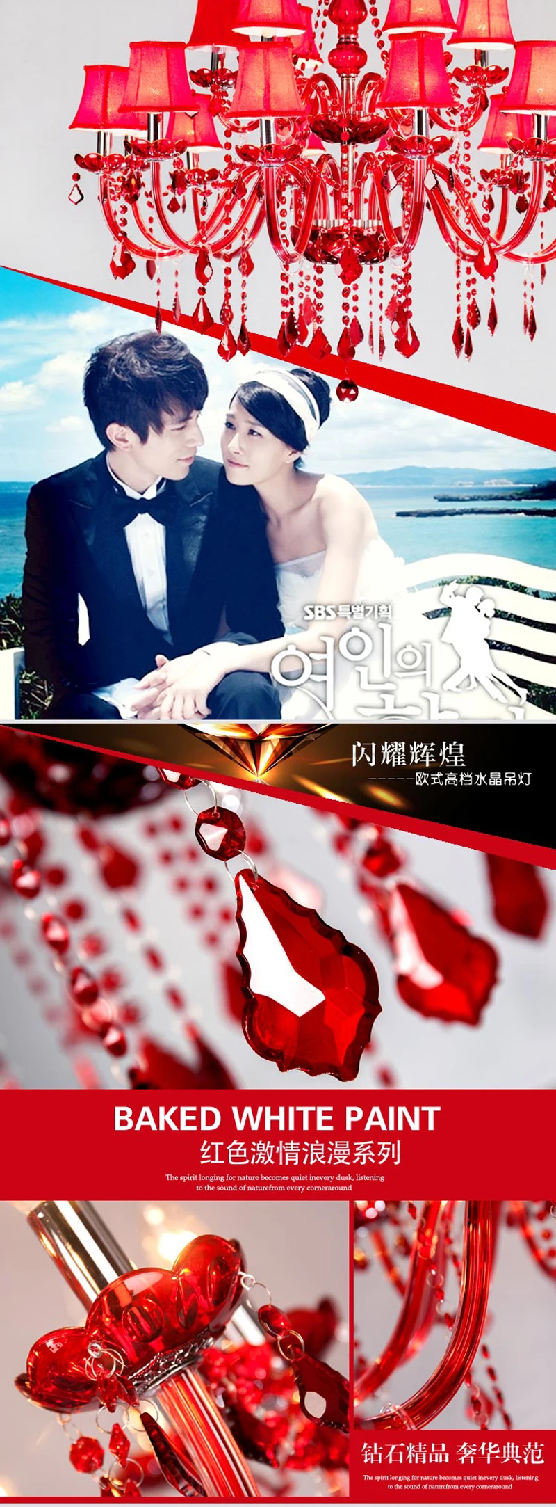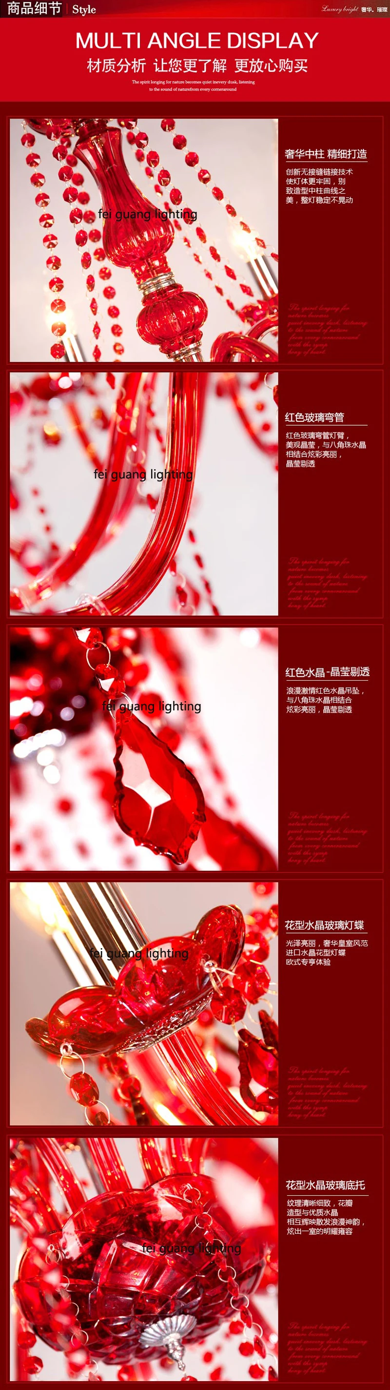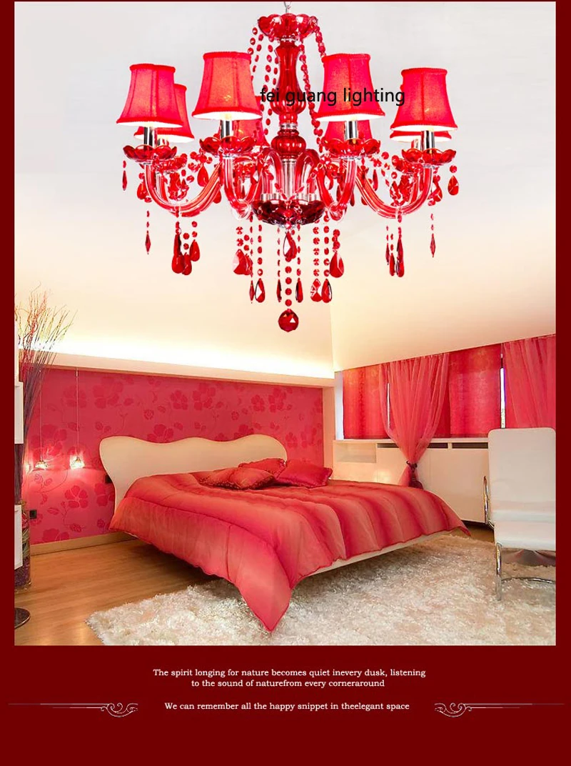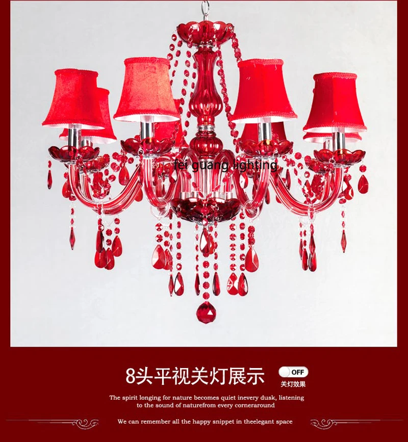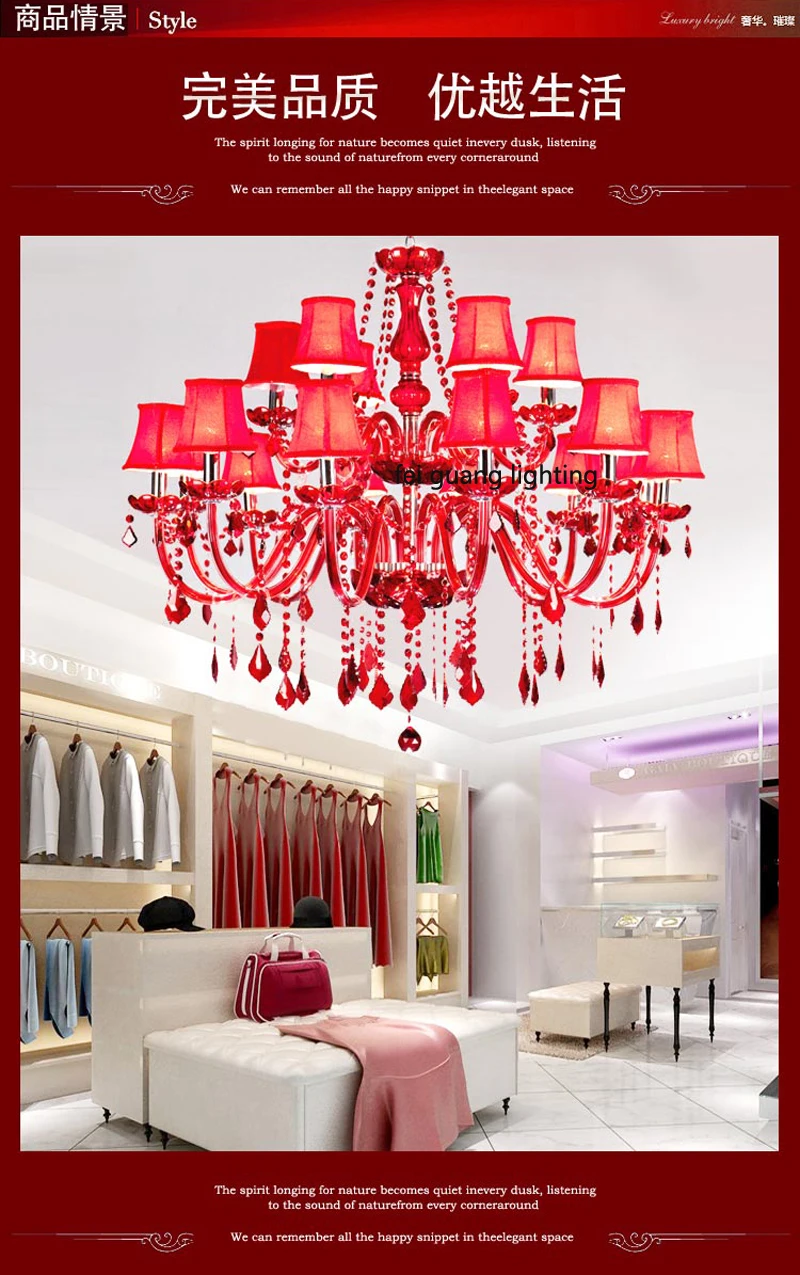 Dieser rote Kronleuchter im Kerzenstil verleiht Innenräumen mit seinem eleganten Design und dem Glaskörper eine kühne und dekorative Note. Die polierte Chromoberfläche und der Stoffschirm erzeugen eine warme, stimmungsvolle Beleuchtung, die sich ideal für Hochzeiten, festliche Dekorationen und stilvolle Wohnräume eignet.