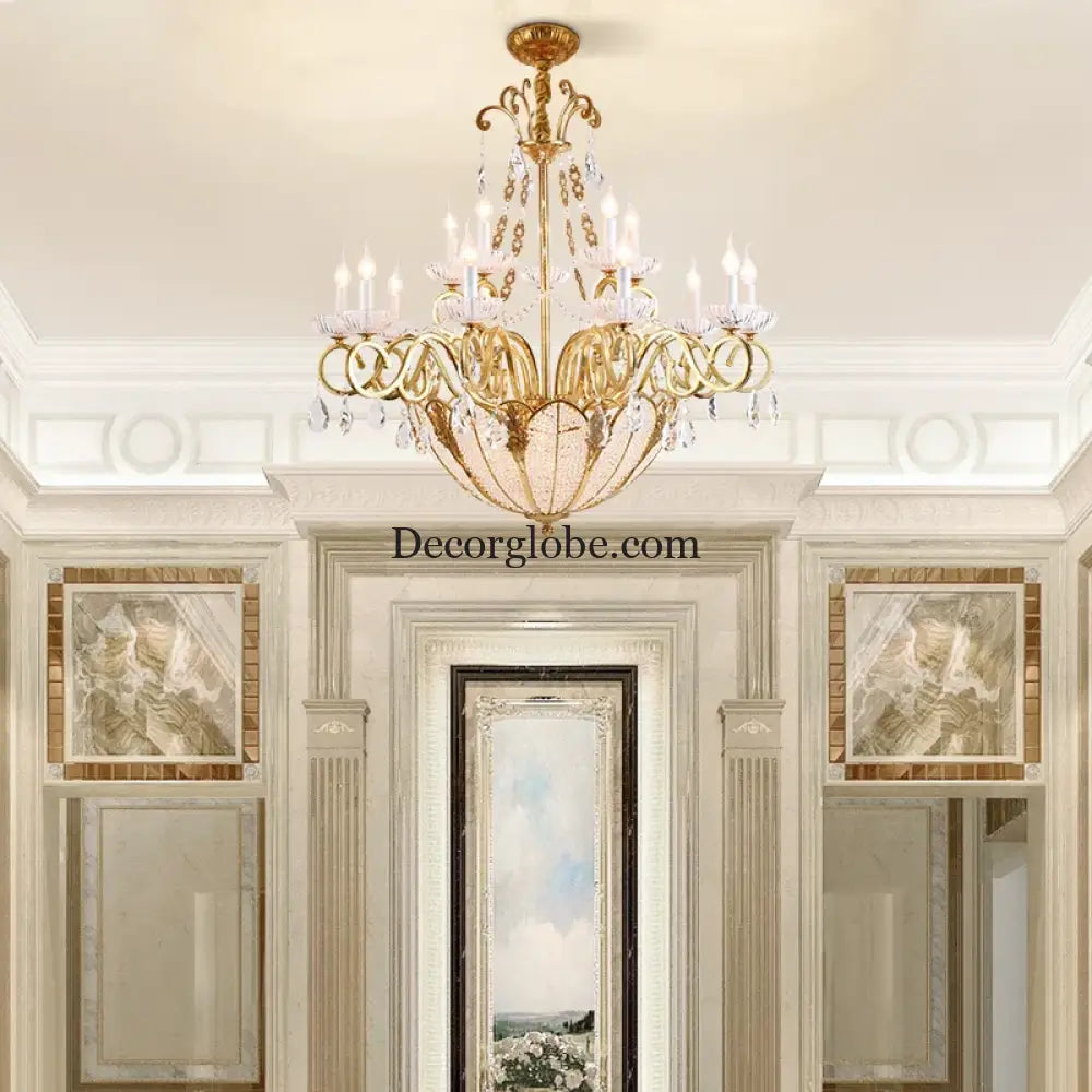 Designed with classic European elegance, this crystal candle brass chandelier brings timeless sophistication to refined interiors. Crafted from durable copper with a warm brass tone, its candle-style arms and crystal accents create a graceful upward illumination. Ideal for villas, living rooms, bedrooms, and hospitality spaces, this chandelier serves as both a decorative centerpiece and a functional lighting solution.