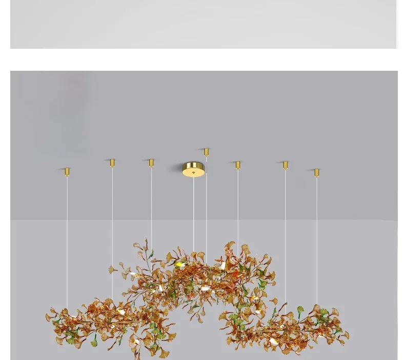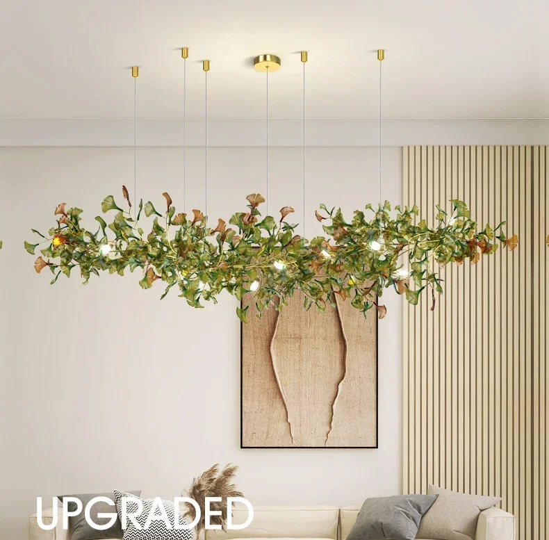 Inspired by the natural elegance of ginkgo leaves, this modern branch chandelier transforms interiors into refined statement spaces. Crafted with a durable ceramic body and accented by stained glass elements, it creates a sculptural lighting display that enhances villas, duplex homes, and staircases. The upward and downward illumination adds depth and brilliance, making it a striking centerpiece for contemporary décor.