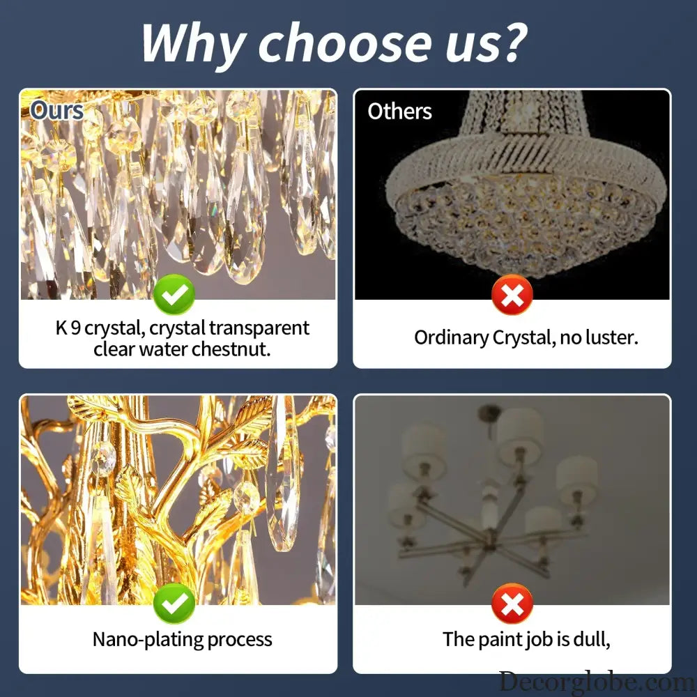 Every Decor Globe chandelier is built on a precision-engineered metal frame for strength and balance. High-clarity K9 crystals are expertly cut for exceptional sparkle and light refraction. Hand-assembled and meticulously inspected for refined performance and lasting elegance.